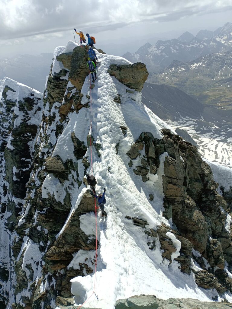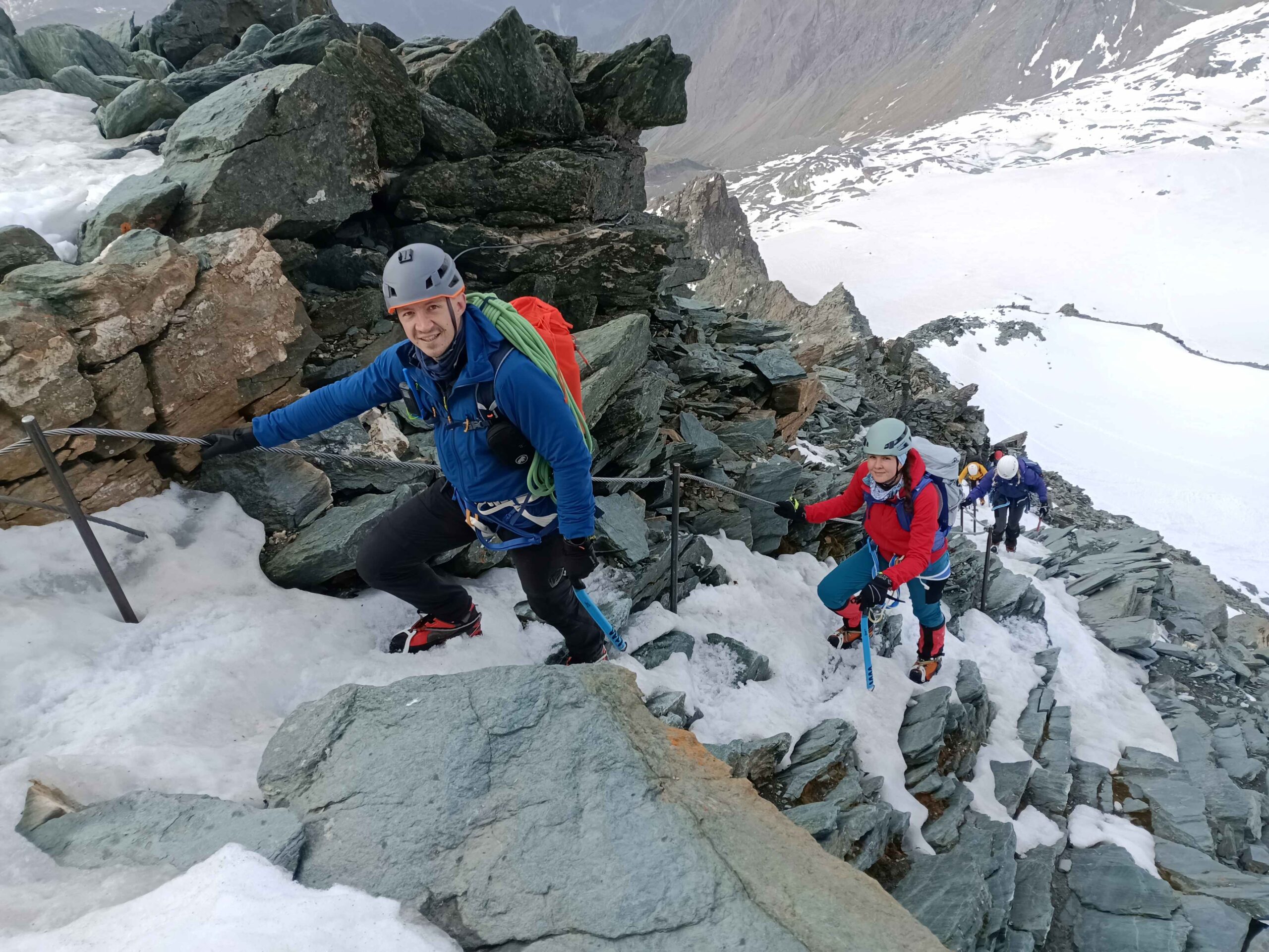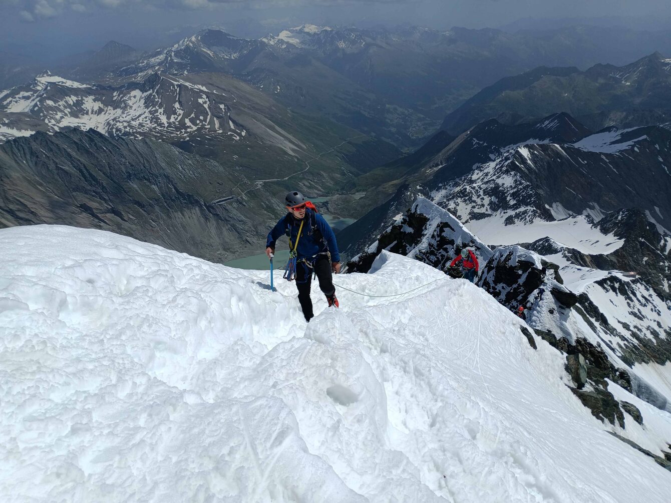 Výstup po hrebeni bol OK, priebežné istenie o oceľové tyče, pred nami ani za nami tlačenica na Kleinglockneri tentoraz nebola. Čerstvý mäkký sneh občas dal zabrať, najmä na Obere Glocknerscharte, finálny cukríček pred Großglocknerom.
