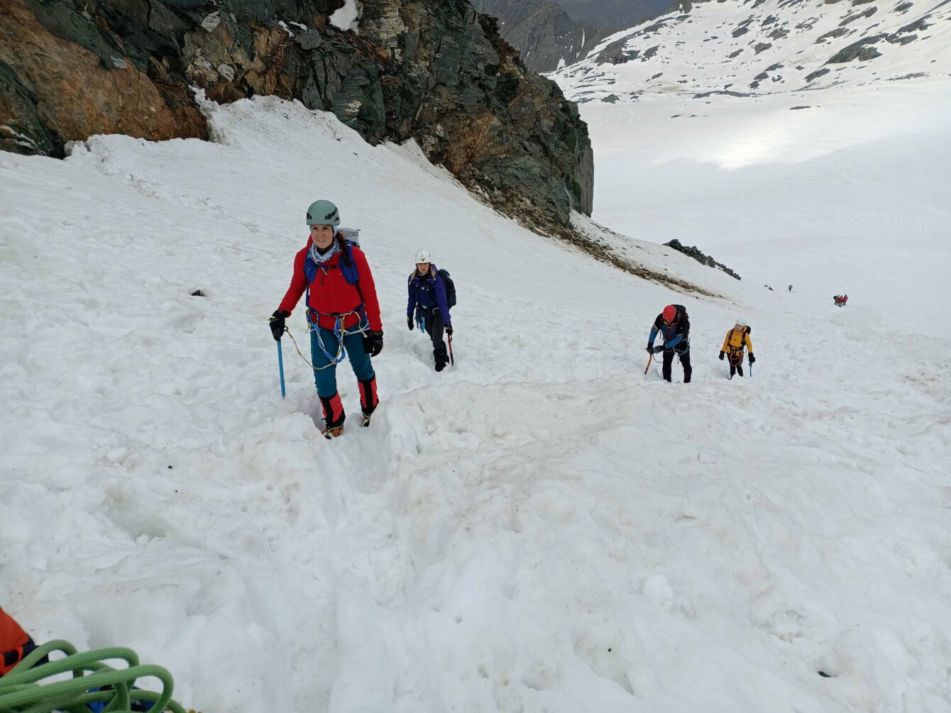V nedeľu ráno sme si dali budíček pred štvrtou, ale po raňajkách sme sa motali, štart až 5:40. Sneh na ľadovci Ködnitzkees bol ešte celkom nosný a na „hornú“ chatu Erzherzog Johann Hütte to šlo v pohode. Motali sme sa tam na chate trištvrte hodiny, takže zápcha bola už nad Bahnhof ( ľadovec) na stupáku na Untere Glocknerscharte. V protismere schádzali tí skorší, šikovnejší a …..í.